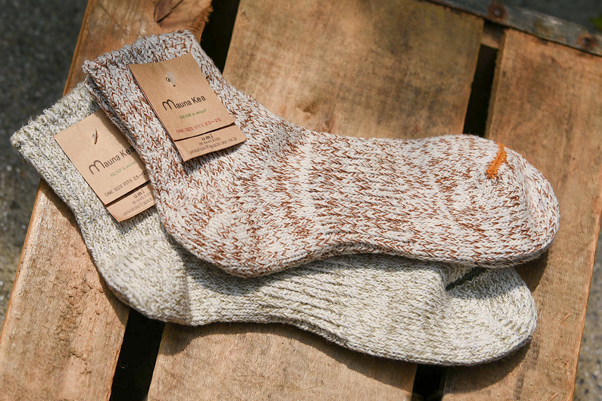漢麻製成的織品也有吸濕透氣、抗菌、不易靜電、耐水洗等功能,作為襪子的織料選擇,給予雙腳舒服又透氣的保護。羊毛和漢麻透過 Mauna Kea 嚴選的比例混紡後,也能製出透氣又保暖的襪子。